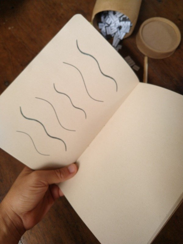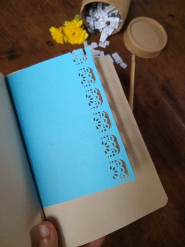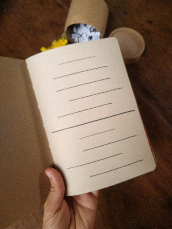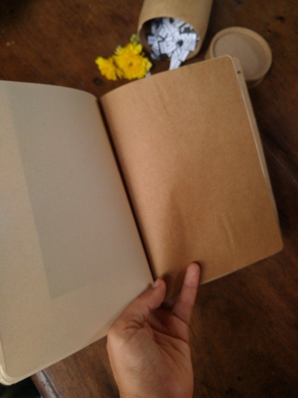 La libreta está confeccionada en papel Kraft de alto gramaje, papel laminado de tapa, hojas impresas con diseños para escribir, papeles de colores para escribir, recortar, pegar y jugar